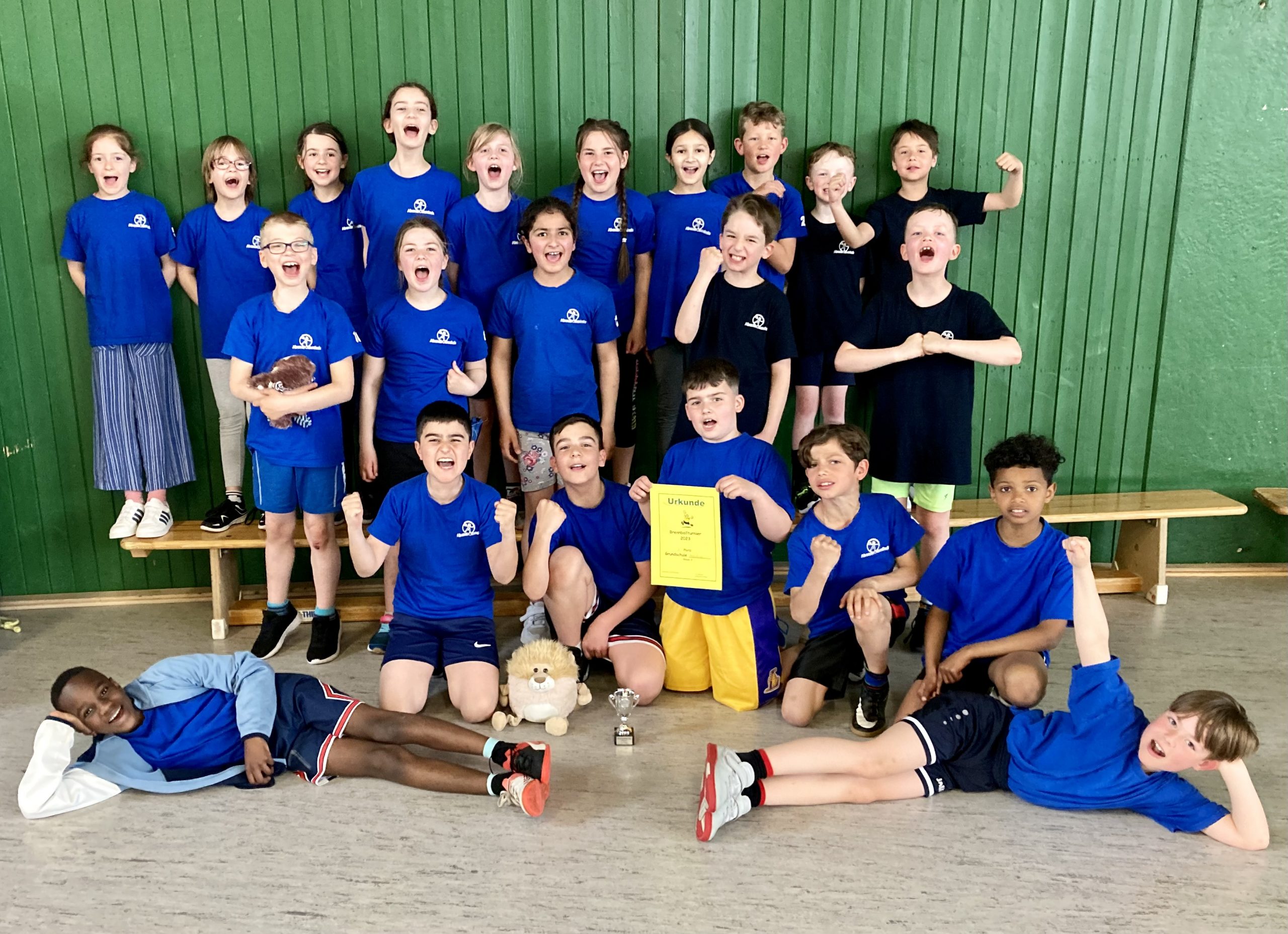 Die 4a der Abendrothtschule erreichte bei den vierten Klassen den ersten Platz und durfte sich über den verdienten Titel freuen. Die Spieler der Mannschaft zeigten eine beeindruckende Leistung, wurden von ihren Mitschülern bejubelt und brachten den goldenen Pokal mit.