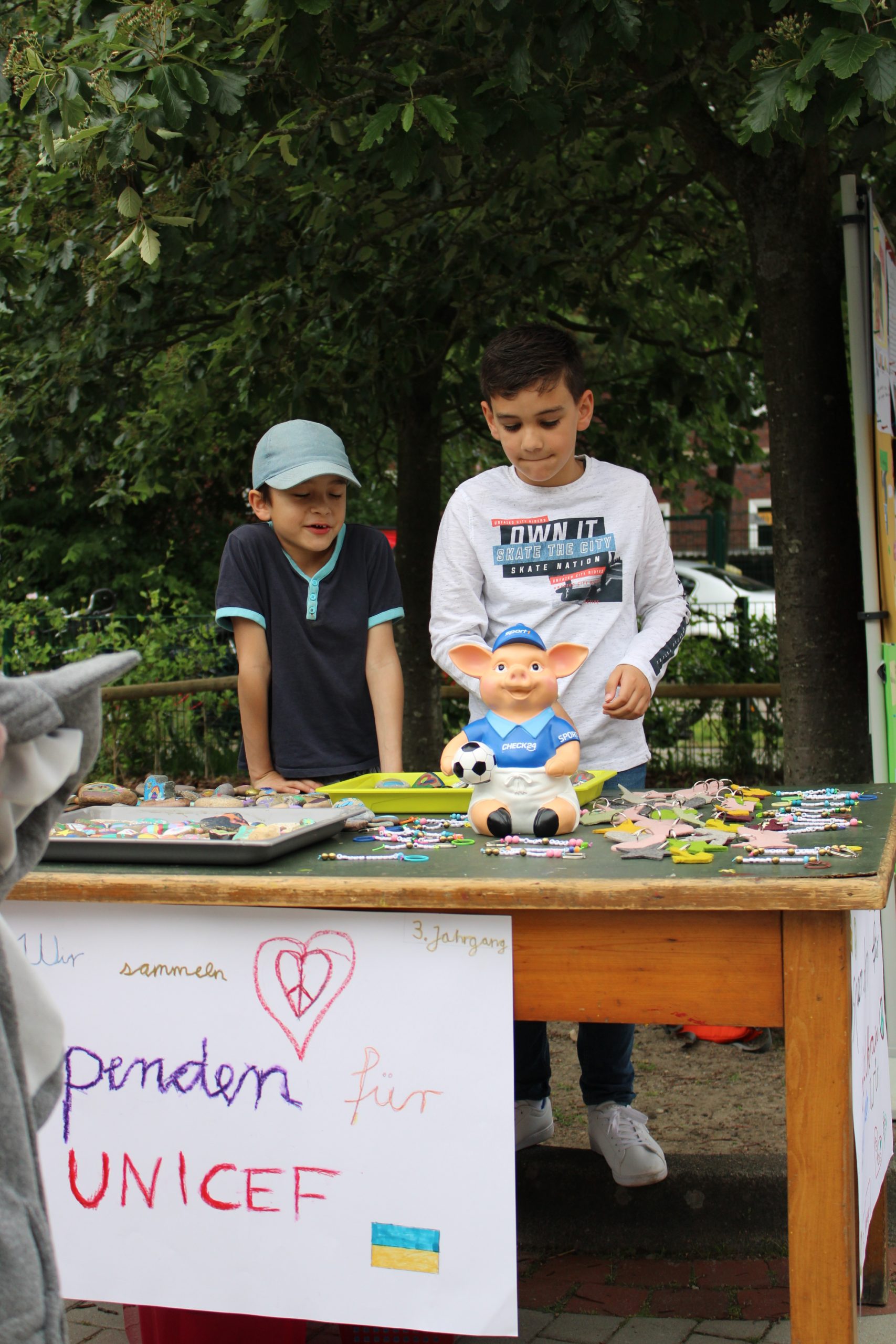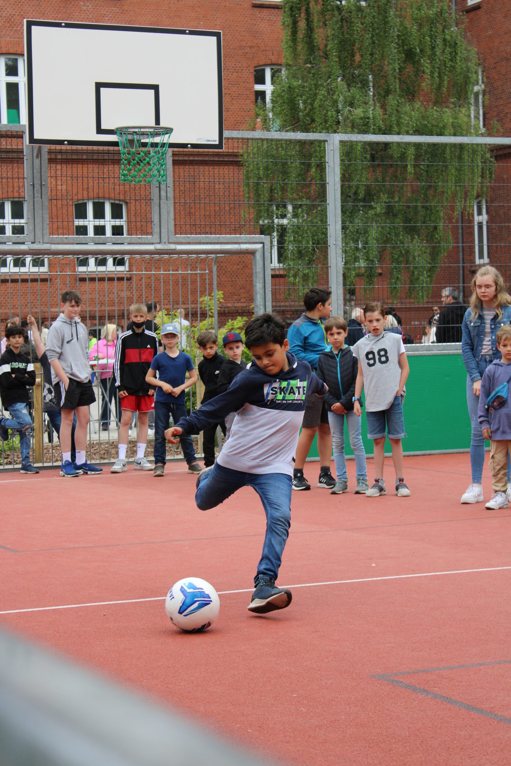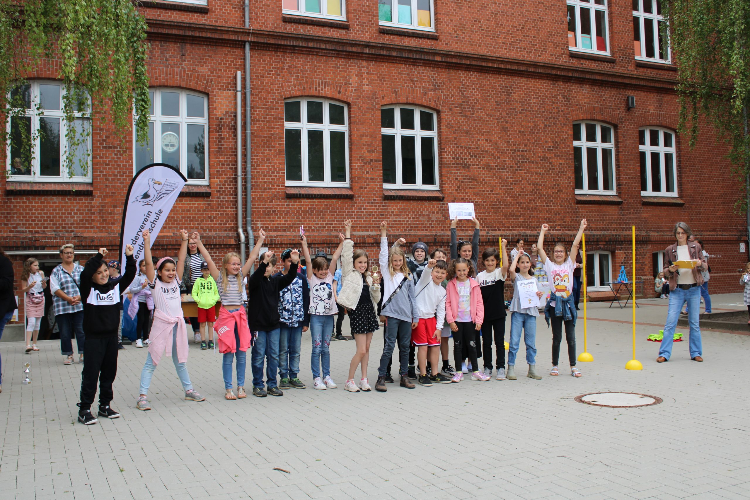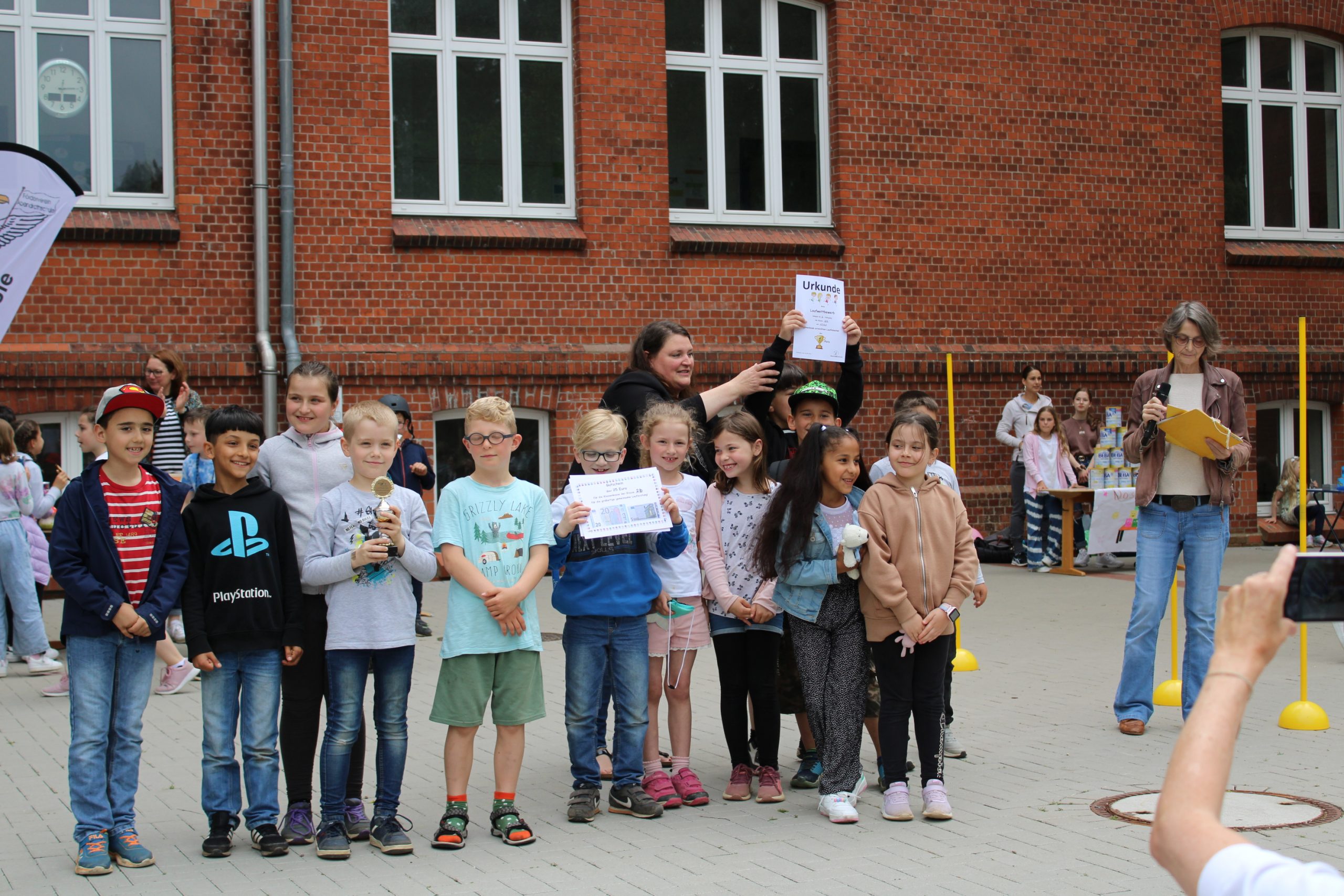 Während der Projekttage konnten die Kinder außerdem ihr Laufabzeichen ablegen. Zu Beginn des Schulfestes fand eine Siegerehrung statt. Die Klassen eines Jahrgangs, die gemeinsam die meisten Laufminuten absolvierten, erhielten einen Pokal und 25 Euro für die Klassenkasse. An dieser Stelle möchten wir uns außerdem noch bei CuxSport für das Bereitstellen der Pokale recht herzlich bedanken.