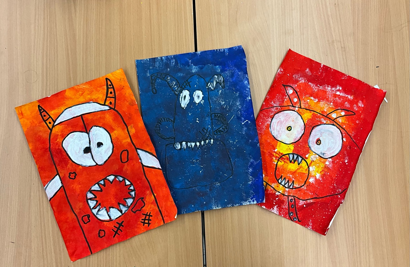 Unsere Sammelmappen wurden als erstes mit „Kalt-Warm-Monstern im Weltall“ bestückt. Dazu wurde erst einmal geklärt: Was sind eigentlich warme und kalte Farben? Dann ging es auch schon an das Tupfen des Hintergrundes mit den kühlen Blautönen und den warmen Rottönen. Mit weißen Sprenkeln haben wir kleine Sterne gezaubert. Und zum Schluss wurden unsere Monster auf die Hintergründe übertragen.