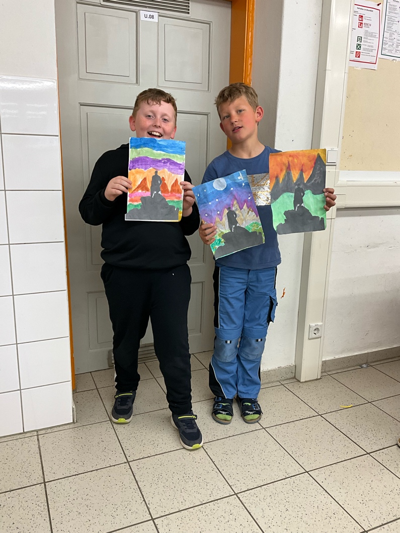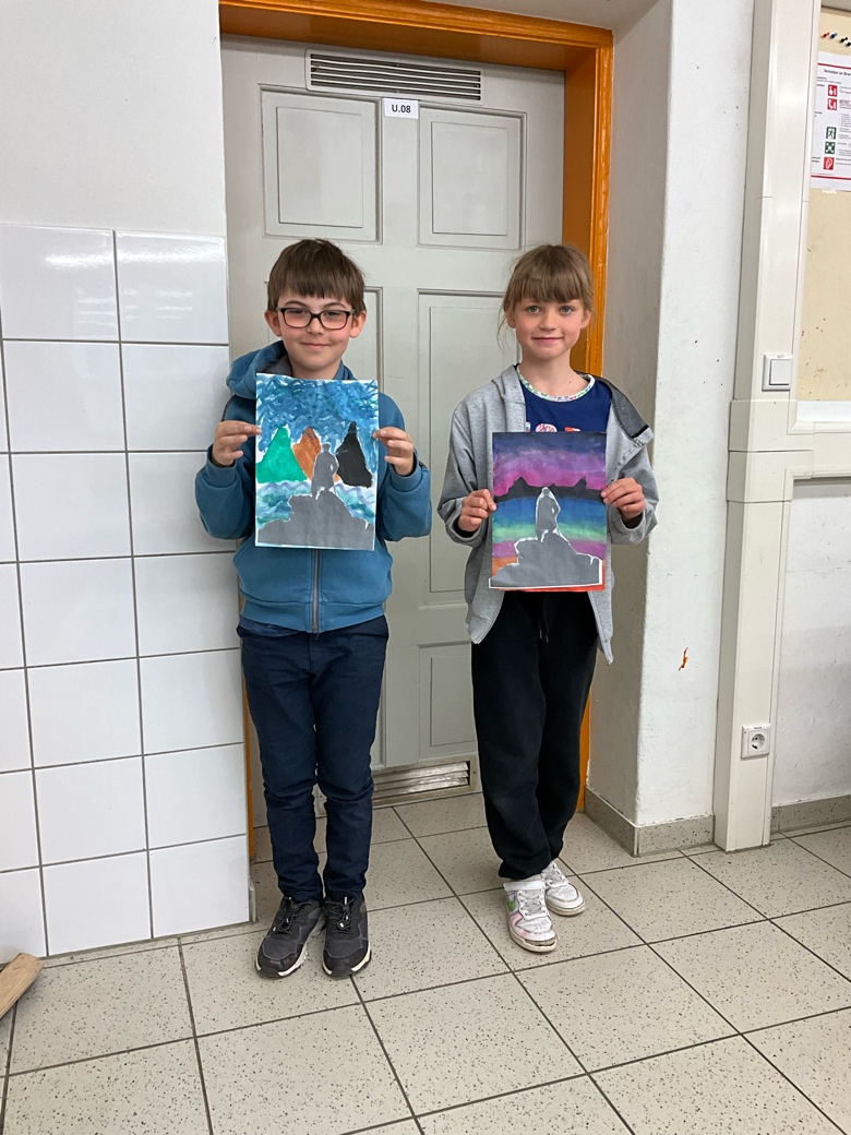 Als Nächstes haben wir einen Künstler kennengelernt: Caspar David Friedrich. Wir haben sein berühmtes Bild „Der Wanderer über dem Nebelmeer“ einmal umgestaltet. Wir haben uns überlegt, wo der Wanderer noch überall spazieren gehen könnte. Schnell ging es an die Arbeit, einen neuen Hintergrund zu malen. Unsere Ergebnisse haben wir „Ein Wanderer verirrt sich“ genannt.